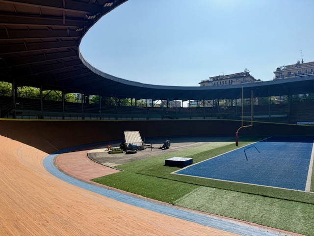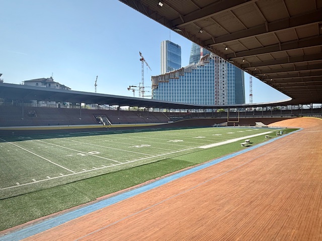 A una prima occhiata si avverte uno strano stridore tra la presenza contemporanea e complementare dei listelli di legno che hanno assaggiato la seta dei tubolari di tutti i più grandi campioni e di quel campo da football americano tutto nuovo e tirato a lucido. Sembra un fotomontaggio malriuscito. «Qui si gioca soprattutto a football», mi ha confidato un amico di Milano che da giovane è stato un ottimo pistard e ora cura gli eventi al Vigorelli. È un’antitesi bella e buona: ilciclismo, esercizio italiano che viene dalla fame e che prevede fatica ed essenzialità, convive pacatamente con il più americano e spettacolare degli sport, il football appunto. E non appena lo sguardo si alza per scrutare oltre il muro opposto, se chi lo fa è persona attenta e intuitiva, scopre che la contraddizione è ancora più palese: a sinistra palazzi agghindati di panni stesi ad asciugare di una città non tanto vecchia da avere conosciuto la Ghisolfa di Testori, ma abbastanza da avere sorseggiato la Milano da bere; a destra a fare da contrappunto i monoliti vitrei e moderni di CityLife. Non raccontiamoci delle fole: il grattacielo non è costruzione che appartiene agli italiani, ma nella città che per antonomasia si trasforma di continuo è possibile assistere a simili stramberie.